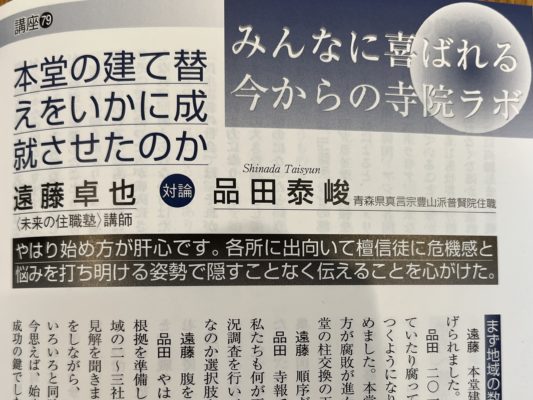 『月刊住職』の連載シリーズ。対論 79人目は青森県八戸市 真言宗豊山派 普賢院 品田泰峻さんにお話しを伺いました。