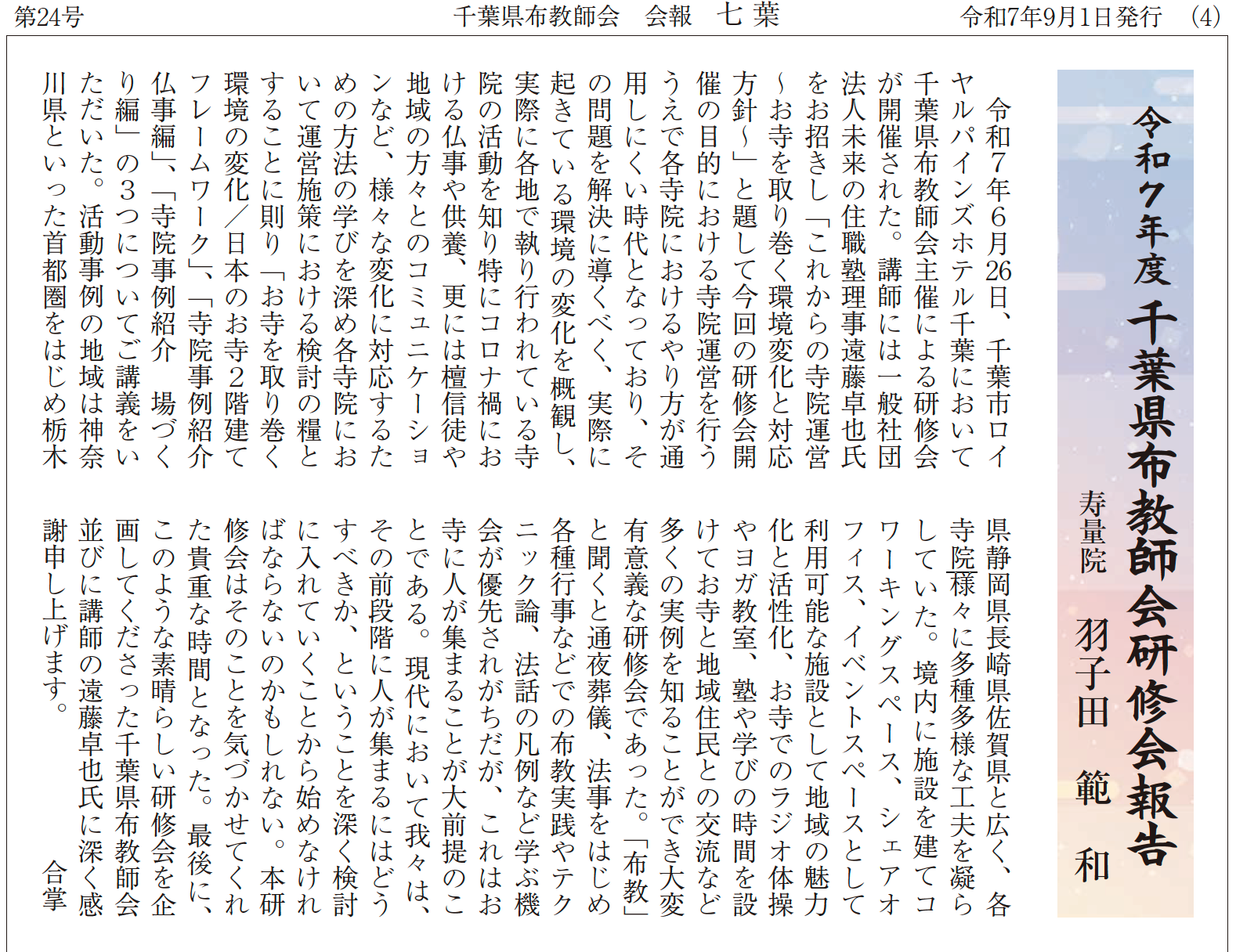 2025年6月26日に千葉市ロイヤルパインズホテルにて開催された、真言宗豊山派 千葉県布教師会研修会での私の講演を、布教師会様の会報『七葉』にてレポートしていただきました。