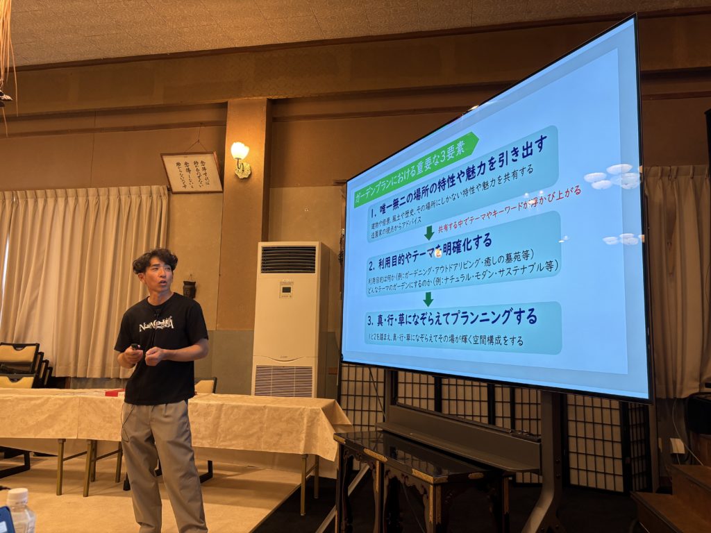 今回は、造成を手掛けた晴照造園の大矢健晴さん(写真)・正蓮寺住職の渡邉元浄さんと一緒に、事例を一般化して参考になりそうなポイントを抽出し、参加の皆さんそれぞれのお寺に戻っても活かせる「目線」を育めるような勉強会になるよう心がけました。