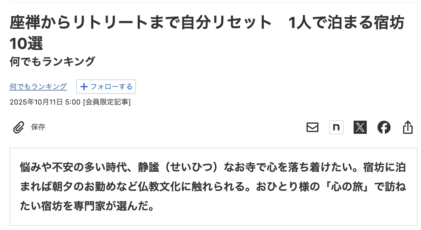 → 座禅からリトリートまで自分リセット 1人で泊まる宿坊10選|何でもランキング(有料記事)
